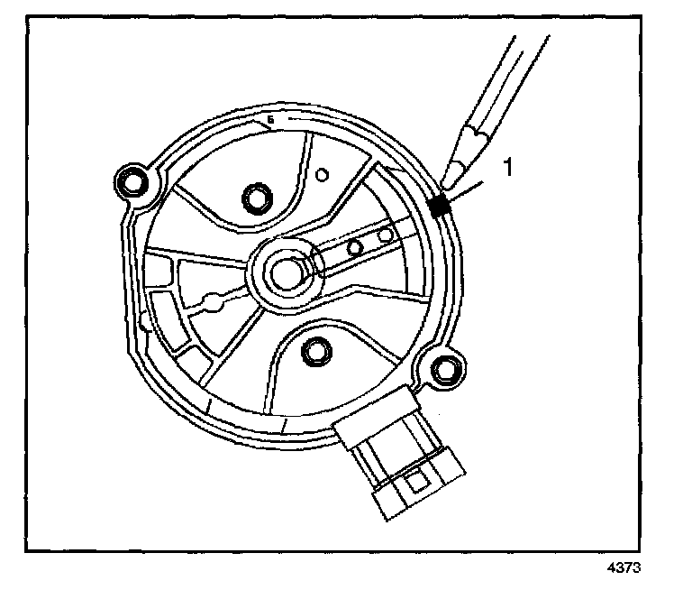 7. Once the distributor is completely seated, the rotor segment should be aligned with the mark on the distributor base (1).