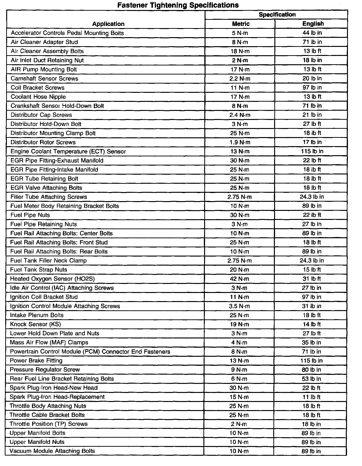 Fastener Tightening Specifications: