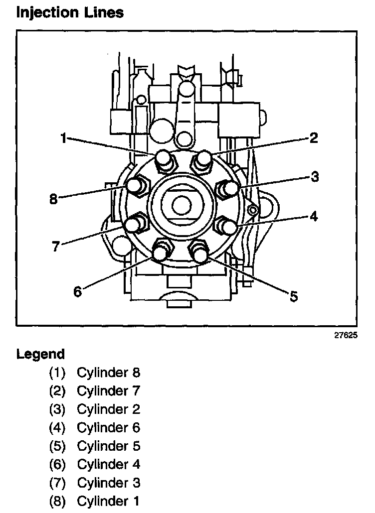 The injection lines connect the high pressure discharge fittings on the head of the injection pump to the injection nozzles. The injection lines are pre-bent for correct routing and connect to the injection pump head as shown in the figure above. The injection lines are equal in length and interior volume.