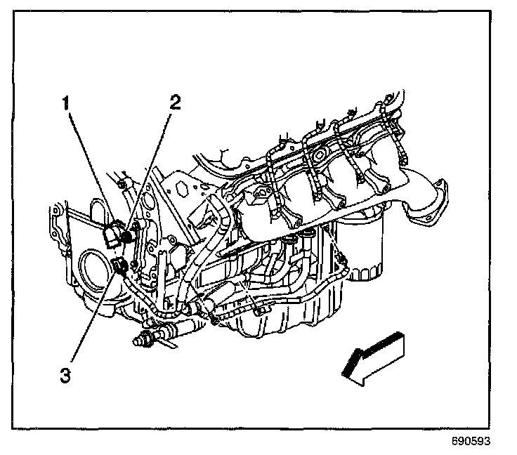 3. Disconnect the camshaft position (CMP) sensor harness connector (3) at the CMP sensor (1).