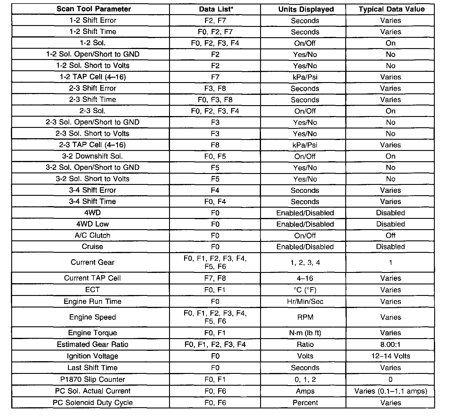 Transmission Scan Tool Data List