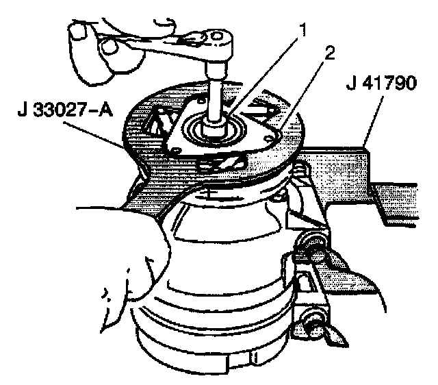 11. Hold the clutch plate and hub assembly (2) with the J 33027-A.