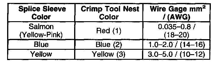 4. Select the proper sealed splice sleeve according to the wire size. Refer to the table at the beginning of the repair procedure for the color coding of the splice sleeves and the crimp tool nests.