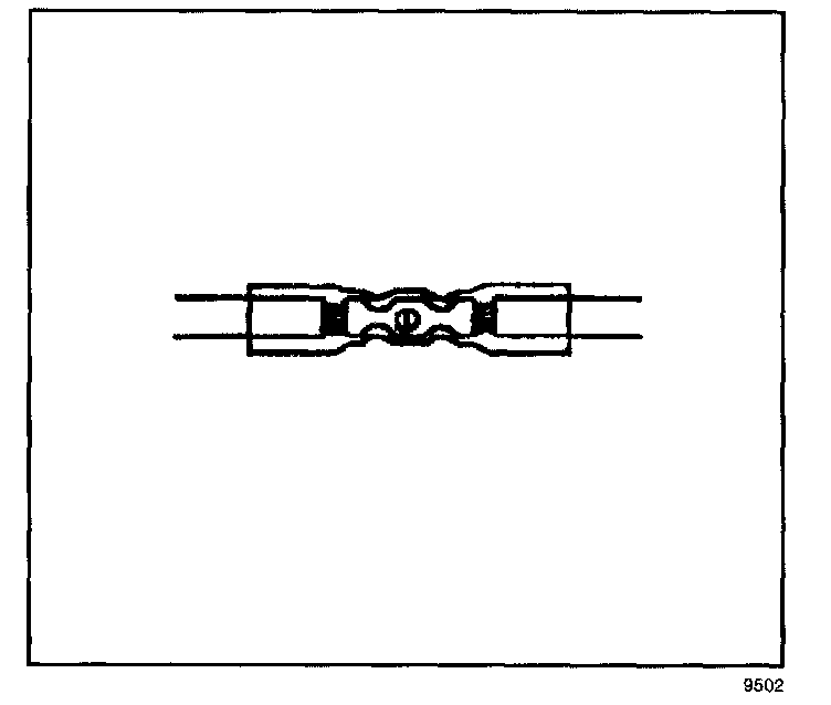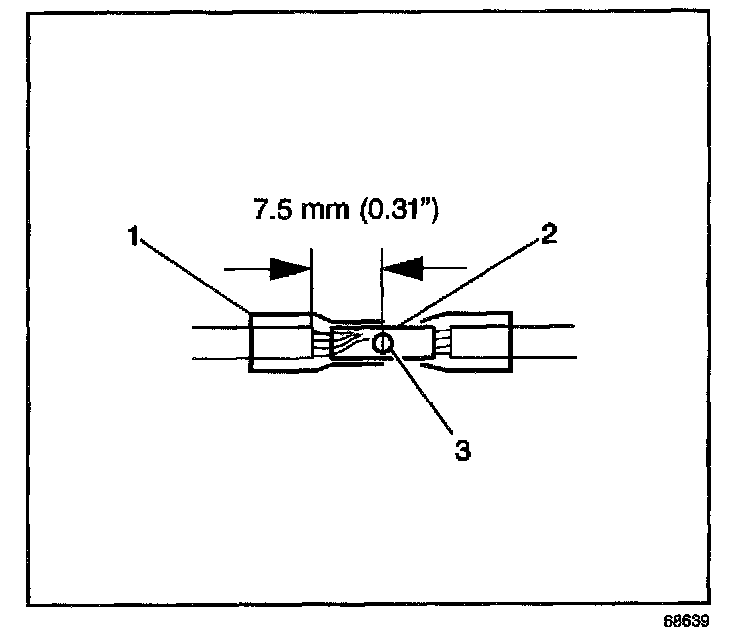 6. Place the splice sleeve in the nest. Ensure that the crimp falls midway between the end of the barrel and the stop. The sleeve has a stop (3) in the middle of the barrel (2) in order to prevent the wire (1) from going further. Close the hand crimper handles slightly in order to firmly hold the splice sleeve in the proper nest.