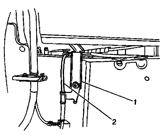 5. Remove the front wheel speed sensor, sensor harness (2), and harness bracket (1) from the vehicle.
