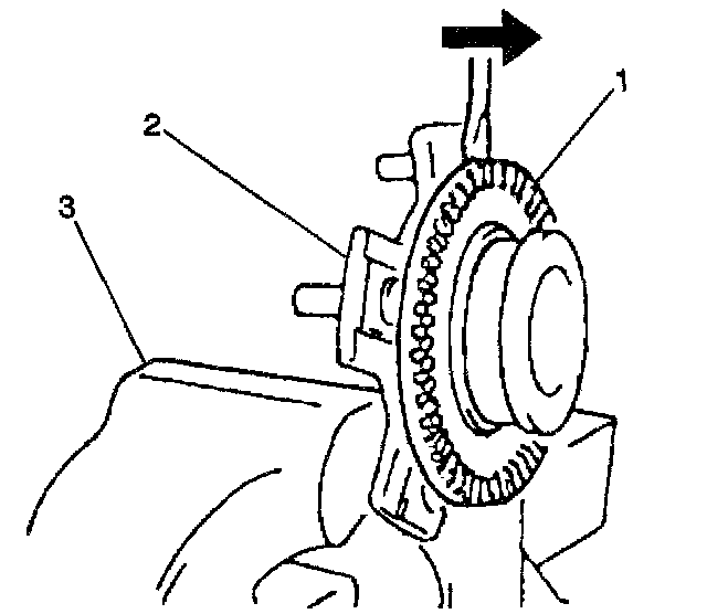 2. Remove the ABS reluctor ring (1) from the wheel hub (2) by prying the ring away from the hub.