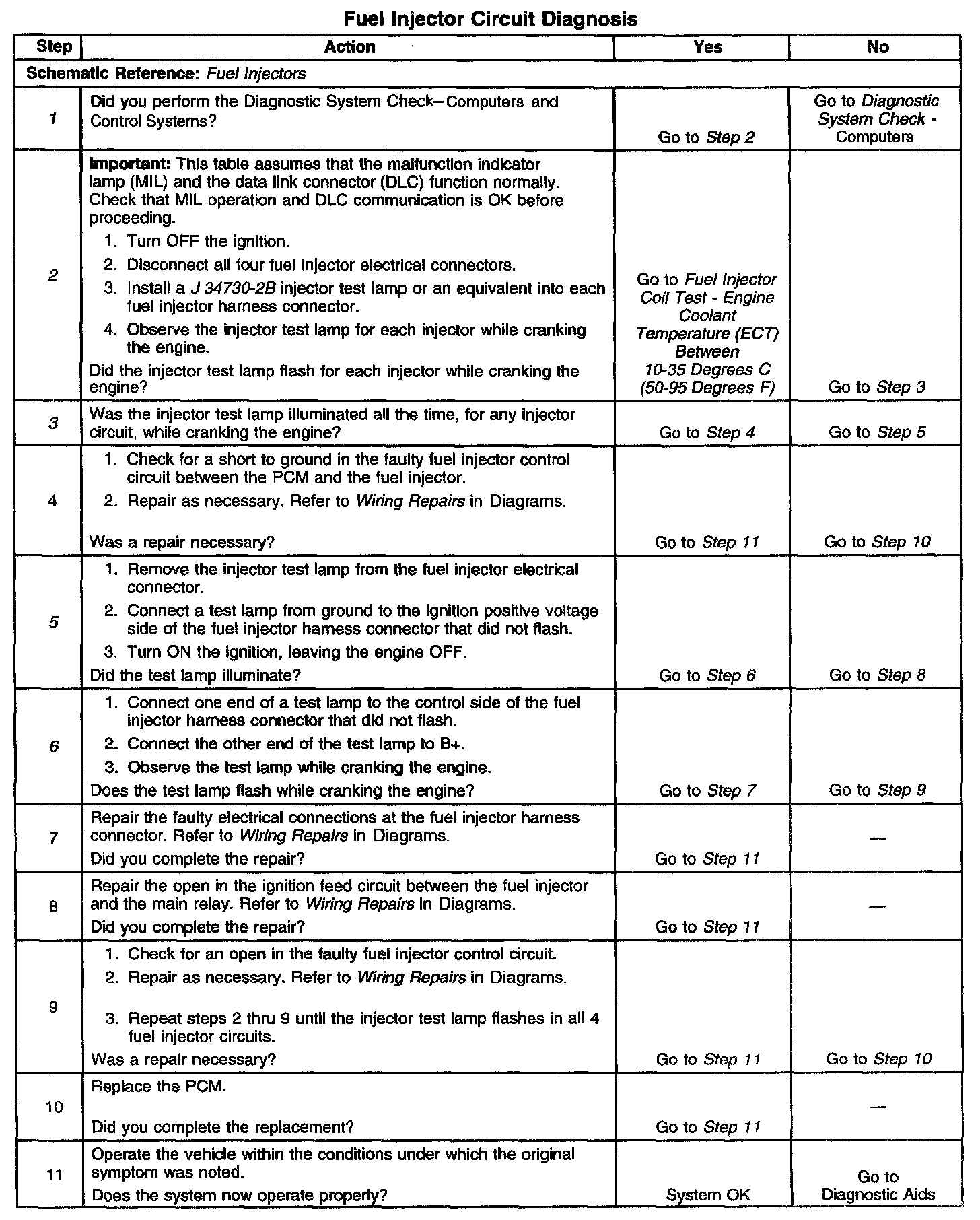 6. This step checks for an open in fuel injector control circuit or for a faulty PCM.