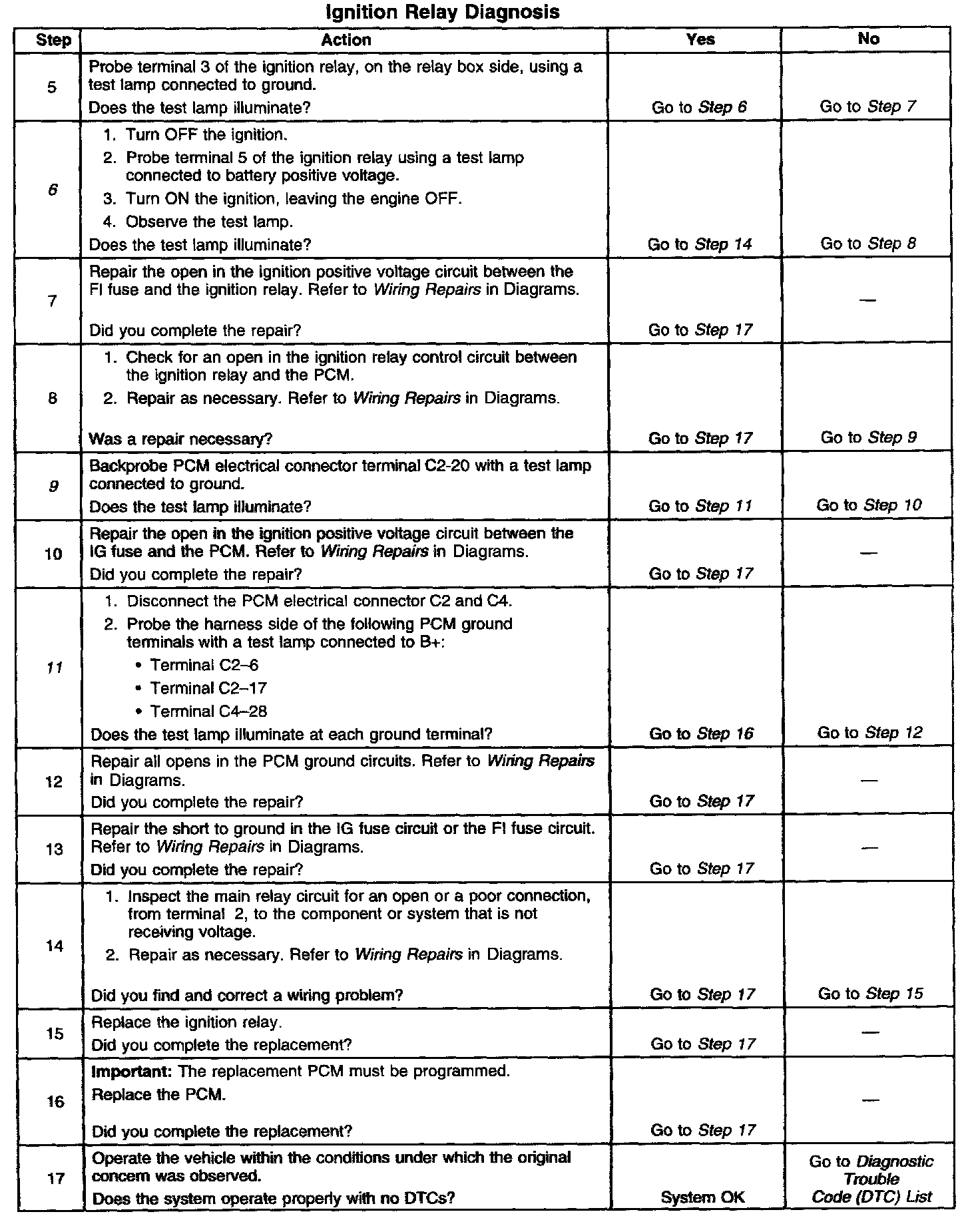 9. This step checks for ignition positive voltage at the PCM. The PCM will not operate the ignition relay if there is no power to terminal C2-20.