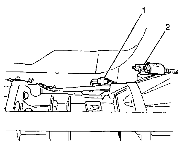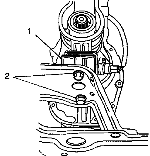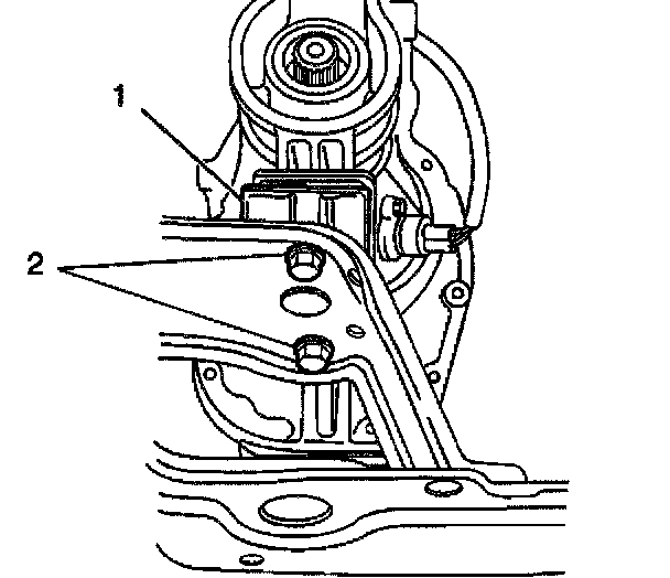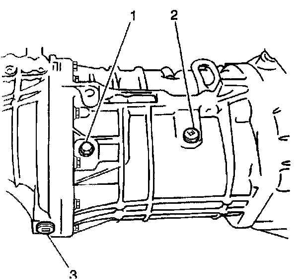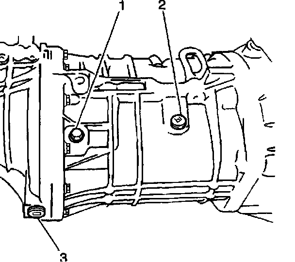20. Add approximately 1.5 liters (1.6 quarts) of synthetic 75W-90 GL4 lubricant, or equivalent, into the transmission oil level/filler plug hole. The oil level should be even with the bottom of the transmission oil level/filler plug hole. Apply the GM P/N 12346004, or equivalent, to the threaded portion of the transmission oil level/filler plug (2).