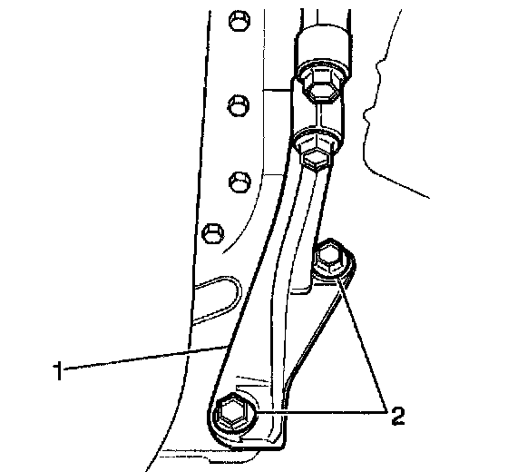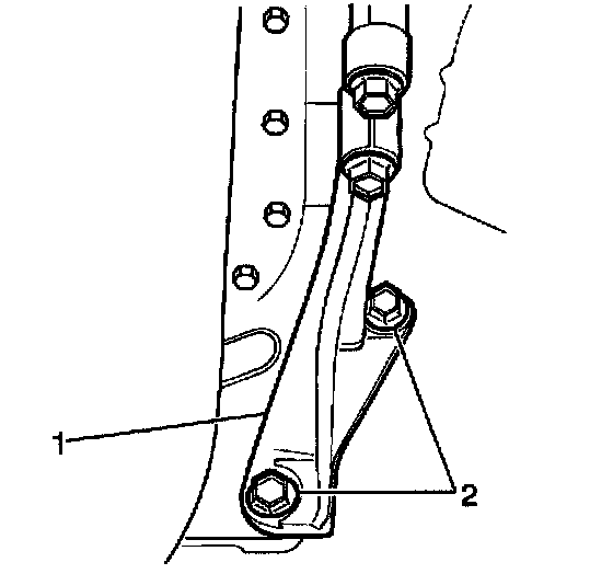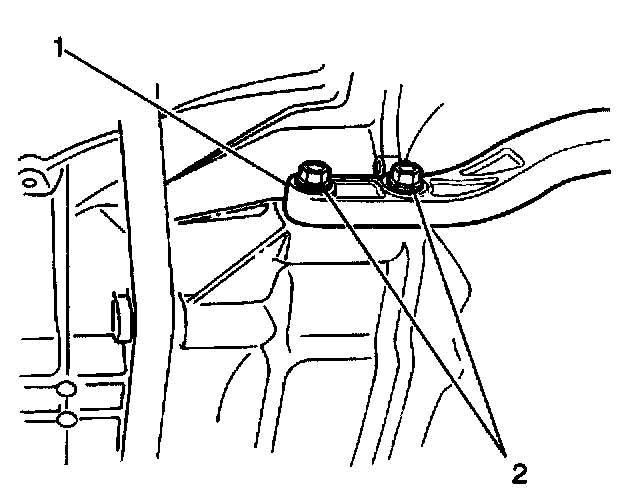 4. Install the 2 bolts (2) into the right transmission-to-engine reinforcement brace (1).