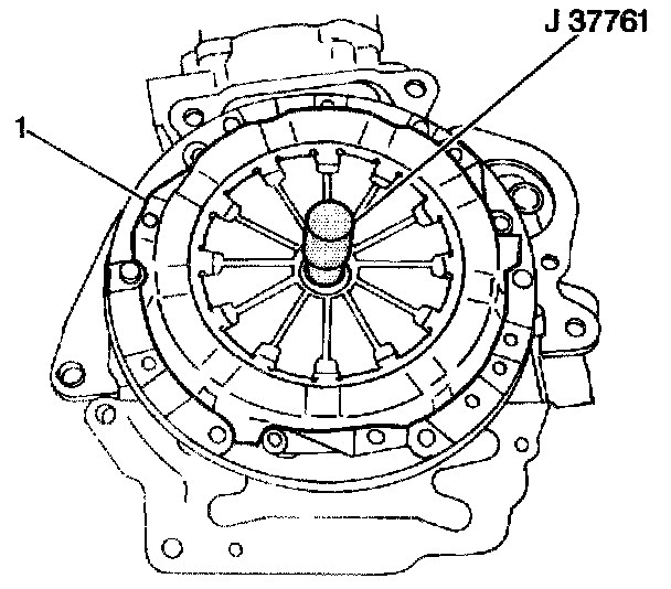 1. Inspect the clutch alignment by inserting the J37761 through the clutch disc and into the crankshaft pilot bearing. If the J37761 does not fit through the clutch disc and into the pilot bearing assembly smoothly, the clutch disc may be misaligned.