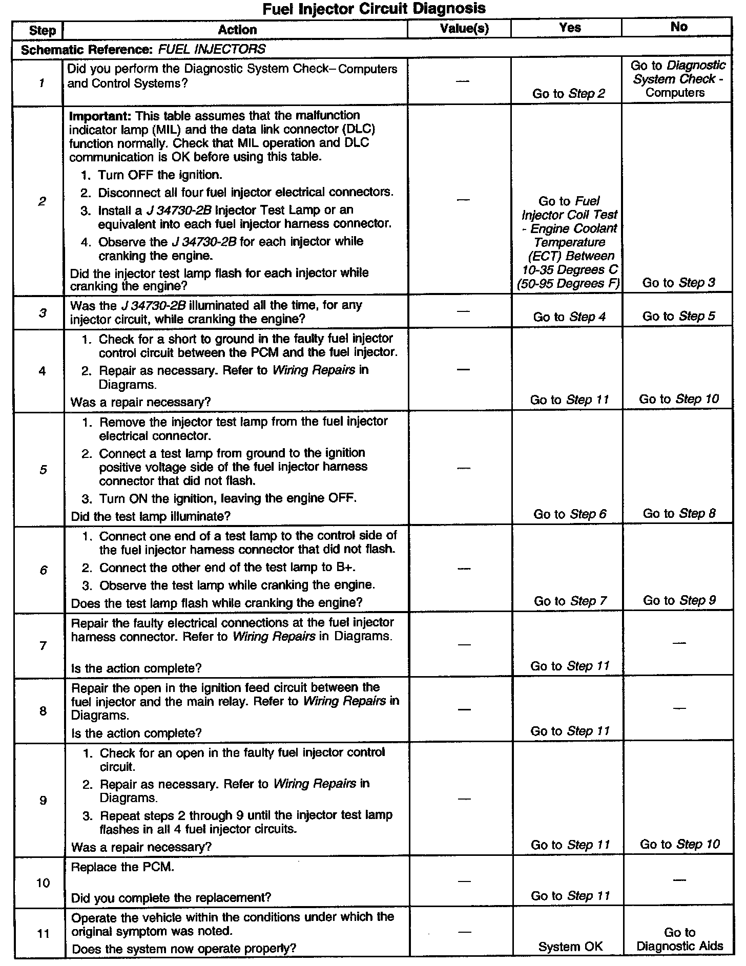 6. This step checks for an open in fuel injector control circuit or for a faulty PCM.