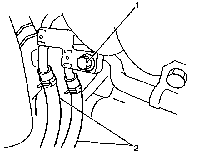 7. Remove the hold down bracket bolt (1) for the fuel pipes (2).
