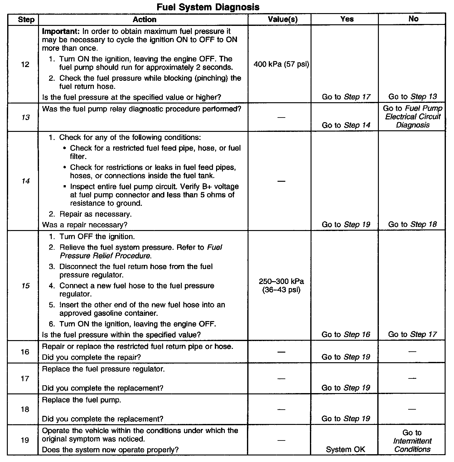 14. This step checks for additional conditions that can cause low fuel pressure other than a faulty fuel pump. Check for any restrictions or blockage in the fuel feed lines and hoses, including those inside the fuel tank. Check the fuel pump electrical circuit for excessive resistance. Proper fuel pump operation requires correct voltage and adequate current flow.