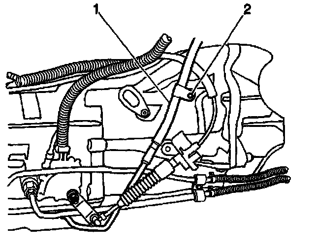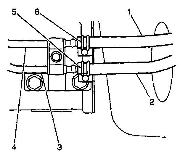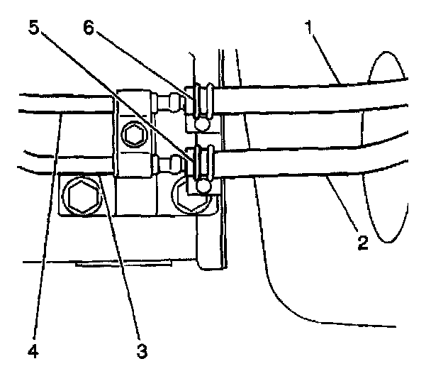 21. Remove the cooler hoses (1,2) and the clamps (5,6) from the transmission pipes (3,4).