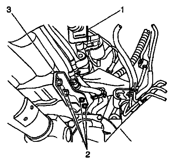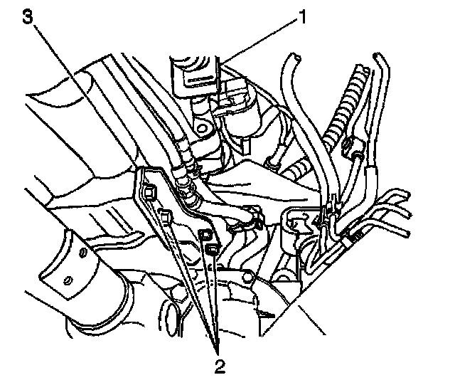 13. Install the engine brace (3) and the bolts (2) to the right side of the transmission.