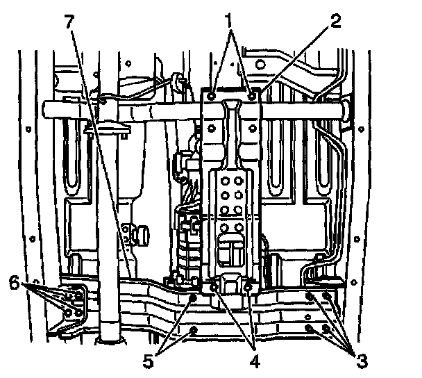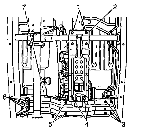 5. Install the crossmember (7) and the crossmember bolts (3,5,6).
