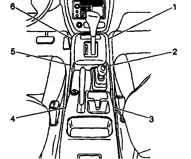 3. Remove the center console screws (1,6) and the clips (2,5).
