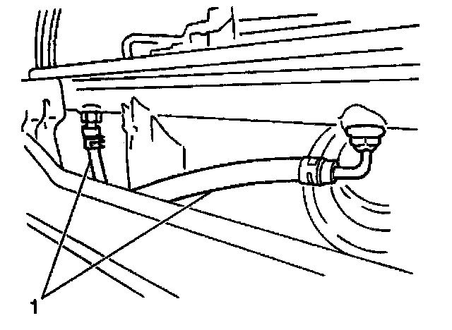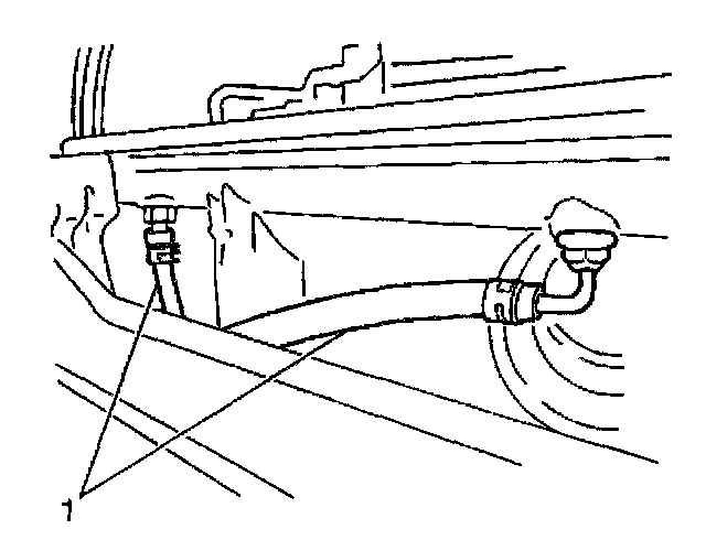 8. Remove the automatic transmission fluid cooler lines (1) from the radiator. Cap the open lines to prevent leakage.