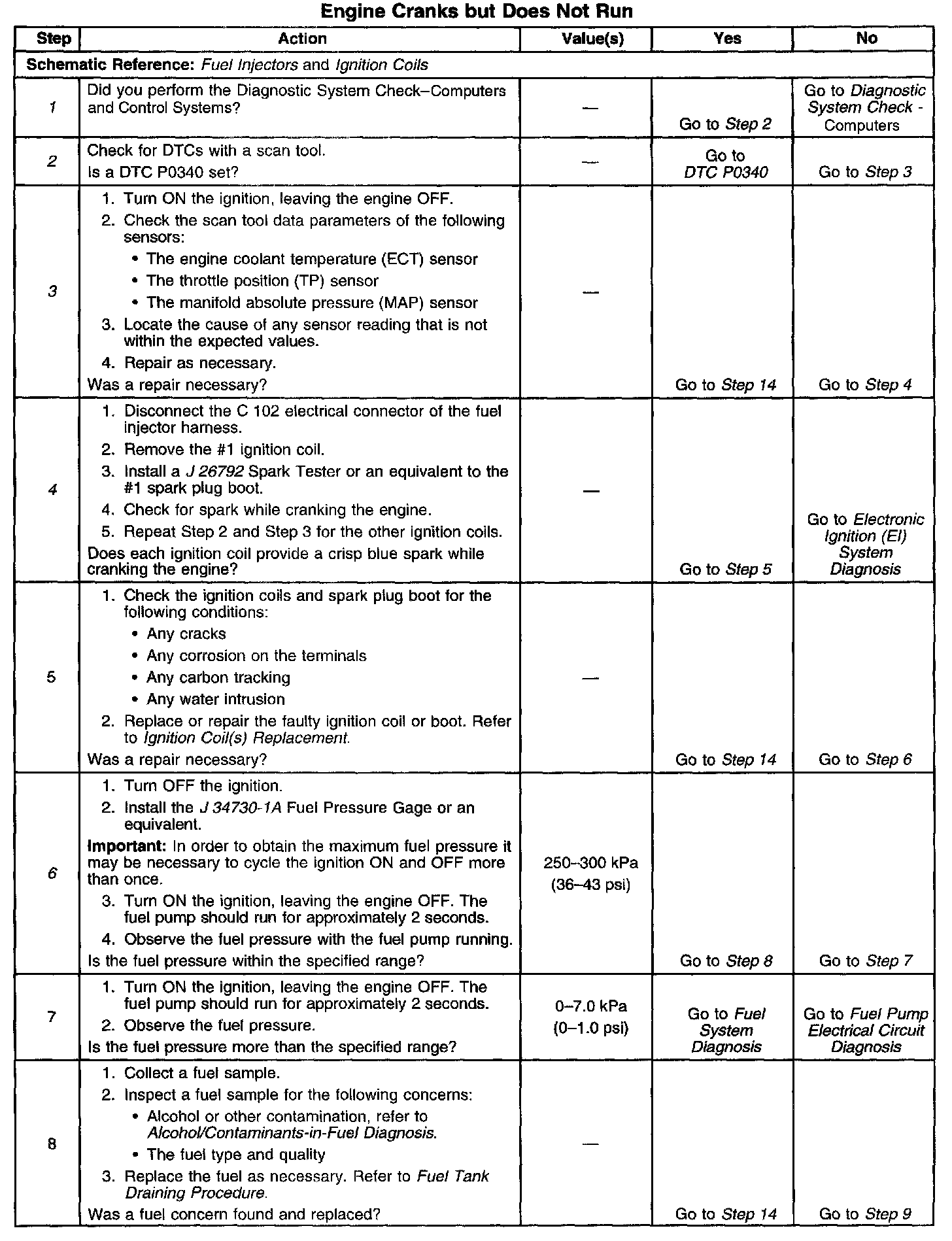 14. This step checks to see if the engine will start and run. The repair that may have led to this step may only have been a secondary cause of the no start condition such as fouled spark plugs. The diagnostics in this table nay need to be performed a second time in order to discover the root cause of the no start condition.