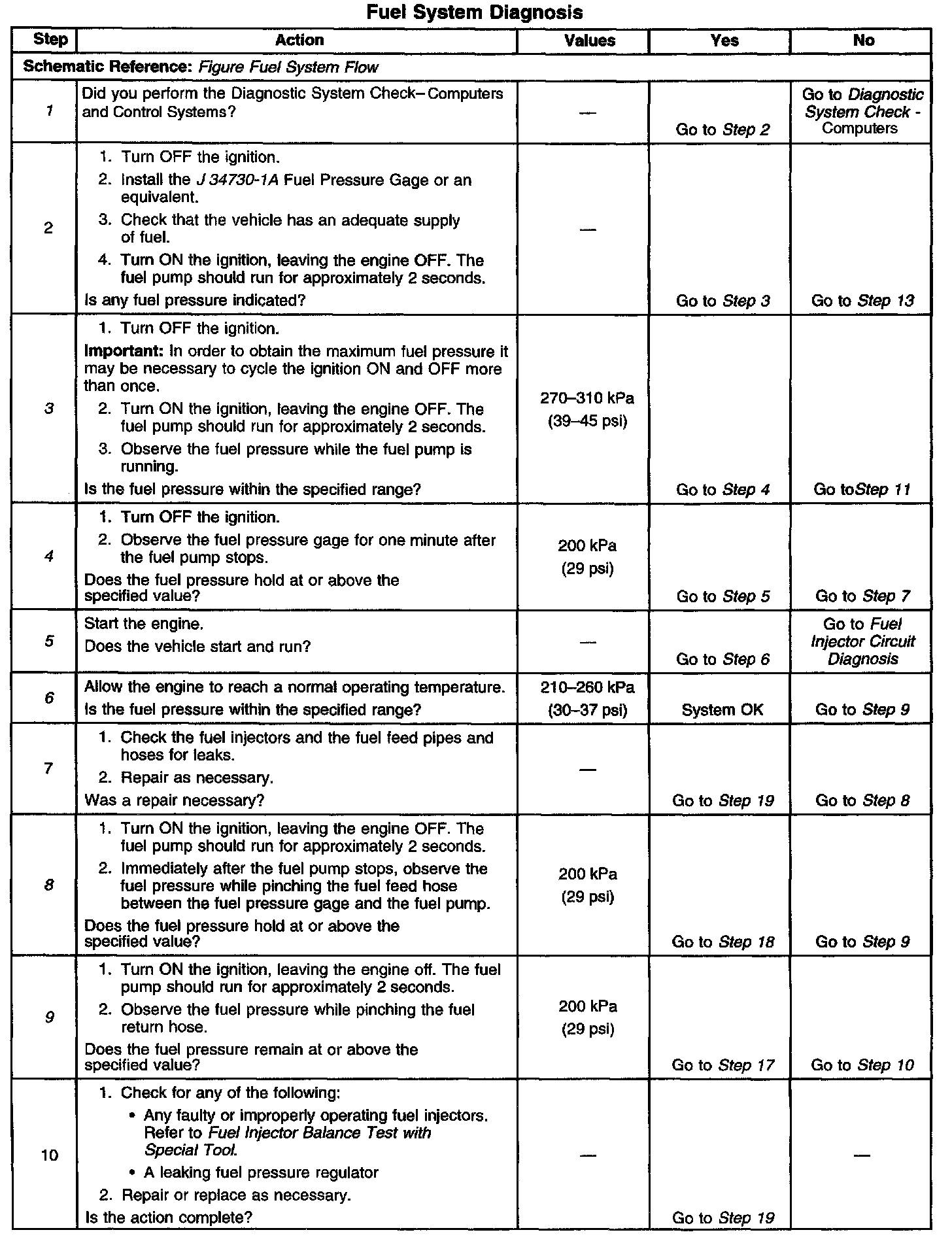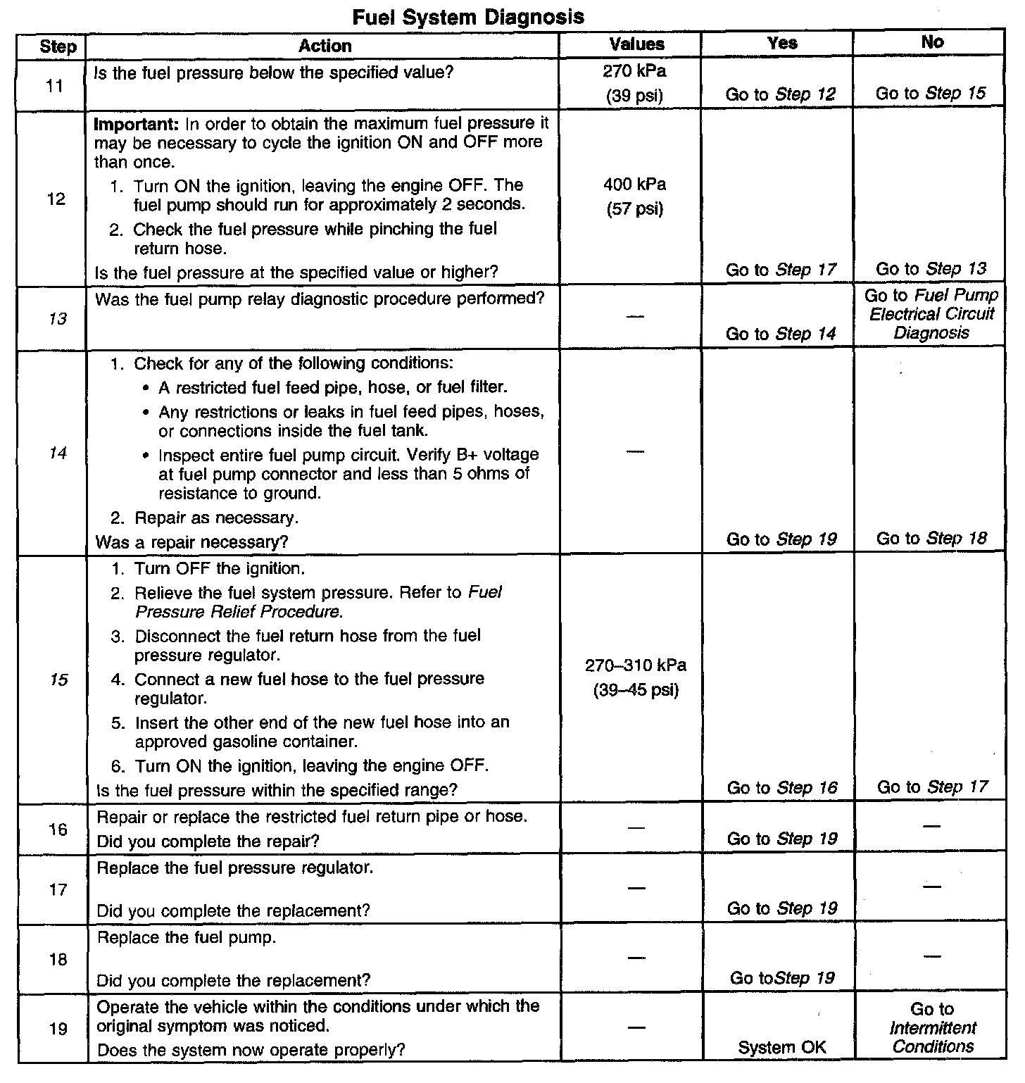 14. This step checks for additional conditions that can cause low fuel pressure other than a faulty fuel pump. Check for any restrictions or blockage in the fuel feed lines and hoses, including those inside the fuel tank. Check the fuel pump electrical circuit for excessive resistance. Proper fuel pump operation requires correct voltage and adequate current flow.