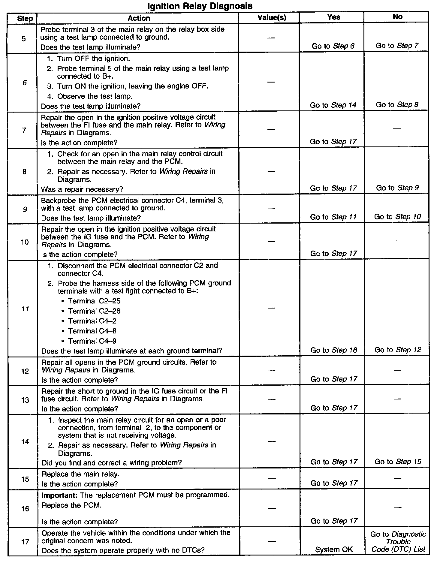 9. This step checks for ignition positive voltage at the PCM. The PCM will not operate the main relay if there is no power to terminal 20.