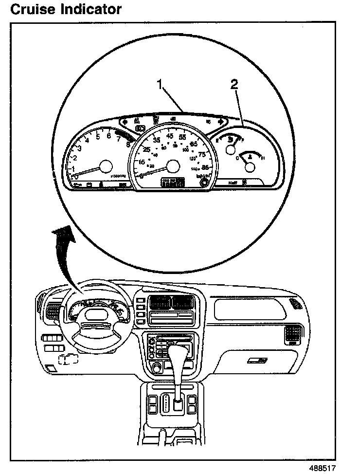 The cruise indicator is in the upper center portion of the instrument cluster (1). The cruise indicator lights in order to inform the driver that the