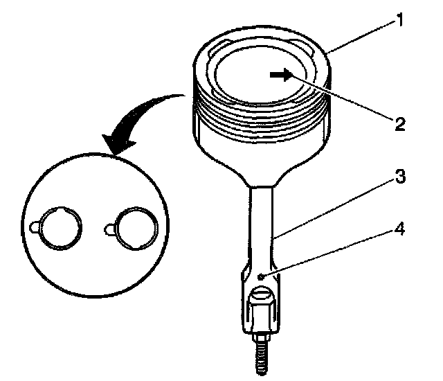 7. Remove the piston (1) and the connecting rod (3) from the cylinder bore by pushing out through the top of the cylinder bore.