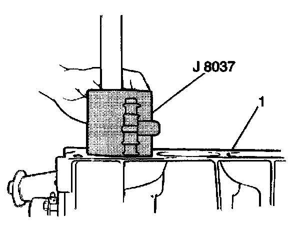 4. Use a hammer handle in order to tap the piston head and install the piston into the cylinder bore. Keep the J 8037 pressed securely against the top of the cylinder block (1) until ail of the piston rings have entered the cylinder bore.