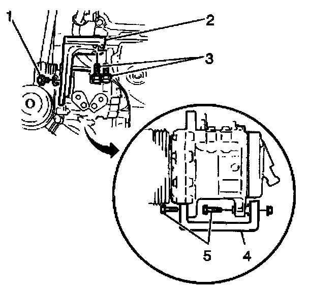 1. Remove the 3 compressor upper mounting bracket bolts (1,3).