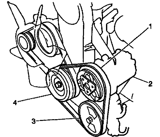 1. Properly route and install the A/C compressor drive belt (1) on the A/C compressor, the power steering (if equipped), and the crankshaft pulleys.