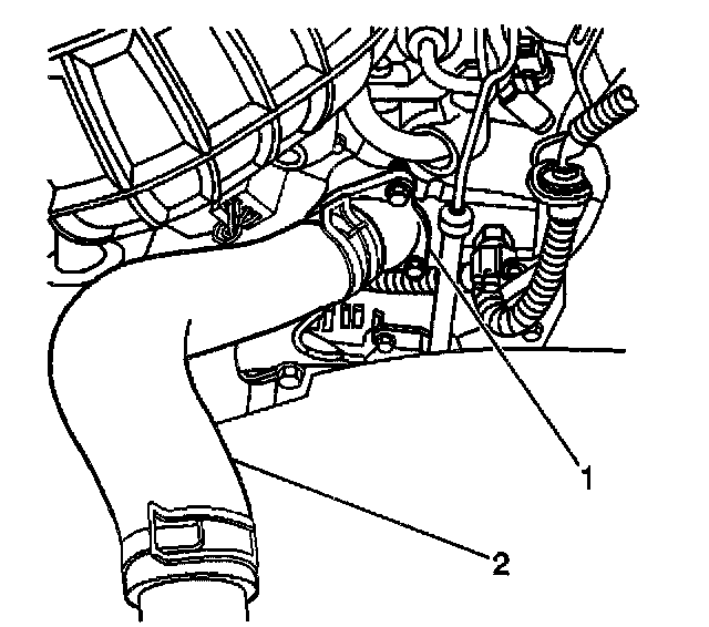 3. Loosen and reposition the hose clamp on the radiator inlet hose at the thermostat housing (1). Remove the radiator hose (2).