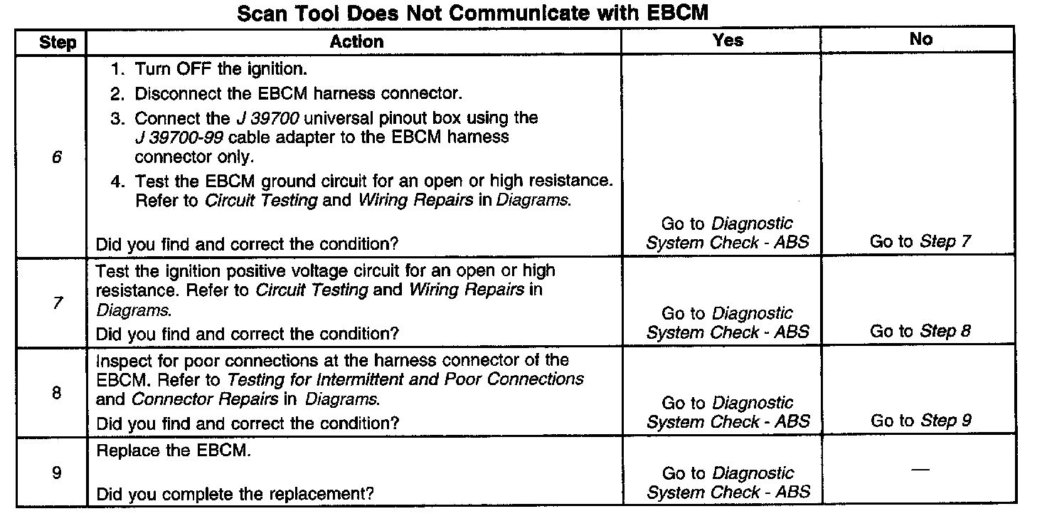 If communication with the EBCM is not possible with a scan tool, ensure these circuits are in good condition and that there is no excessive resistance. Also check the EBCM connectors for poor connector terminal contact.