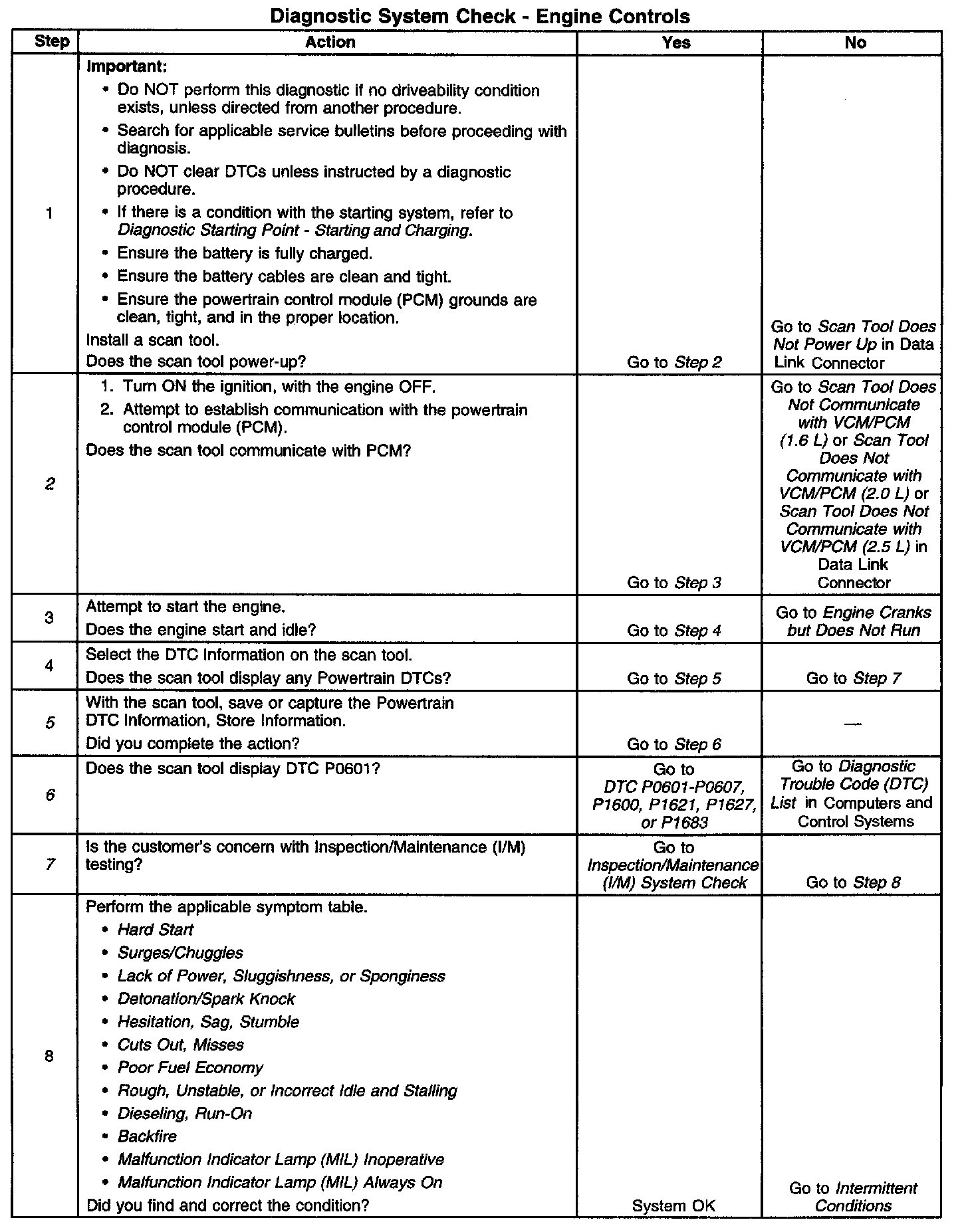 The Diagnostic System Check is an organized approach to identifying a condition that is created by a malfunction in the powertrain control system. The Diagnostic System Check must be the starting point for any driveability concern. The Diagnostic System Check directs the service technician to the next logical step in order to diagnose the concern. Understanding and correctly using the diagnostic table reduces diagnostic time, and prevents the replacement of good parts.
