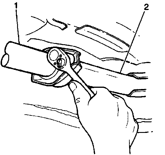 4. Remove the two nuts from the catalytic converter assembly (1) and separate from the resonator/muffler/tail pipe assembly (2).