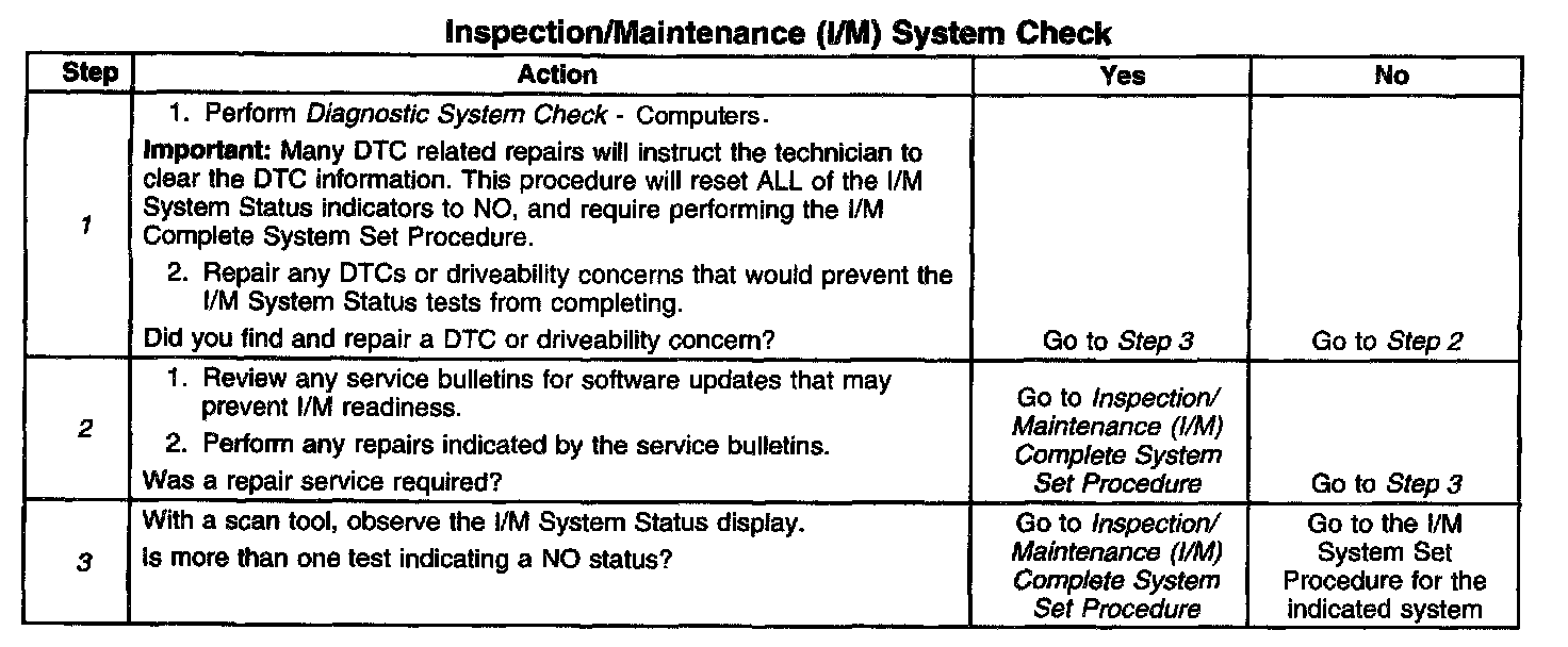 1. Any DTCs set, even those that are not listed in the Inspection/Maintenance System DTC Table, may prevent the required DTCs from running. If there is any question as to whether a set DTC is disabling the required I/M diagnostic, review the Conditions for Running in the diagnostic procedures for the DTC required by the I/M diagnostic. A list of disabling DTCs, if applicable, is contained in the supporting text for that DTC.