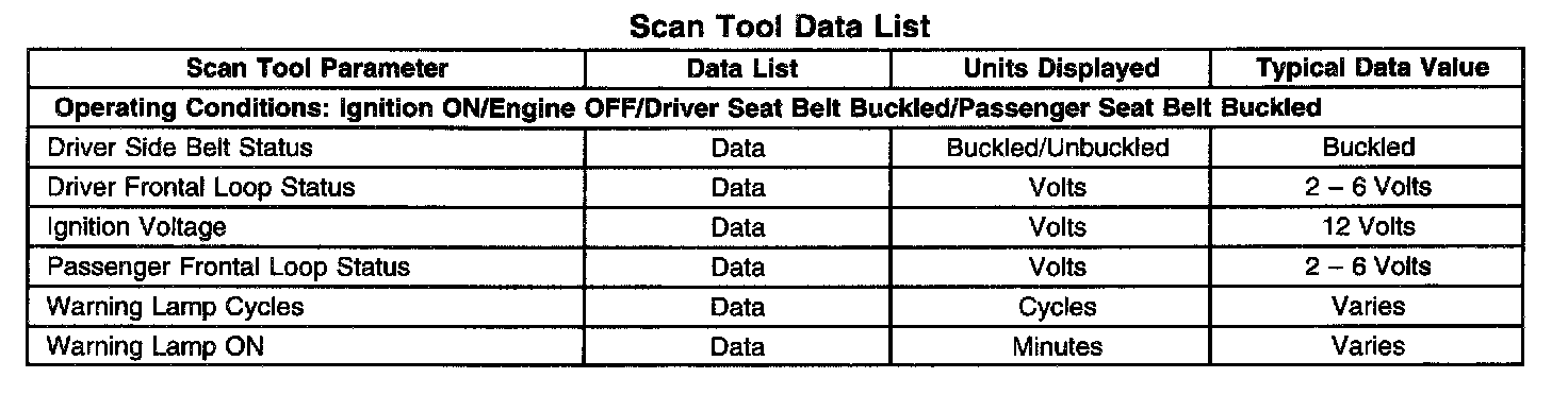The SIR scan tool data list contains all the restraint system related parameters that are available on the scan tool. The parameters in the list are arranged in alphabetical order. The column, Data List, indicates the location of the parameter within the scan tool menu selections. Use the SIR scan tool data list as directed by a diagnostic table or in order to supplement the diagnostic procedures. Begin all diagnostic procedures with the SIR diagnostic system check. Use the SIR scan tool data list after the following is determined: