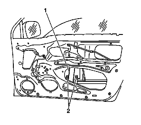 2. Install the door window (1) to the front side door. Secure the window to the front side door window regulator with the 2 mounting screws (2). Do not tighten fully at this time.