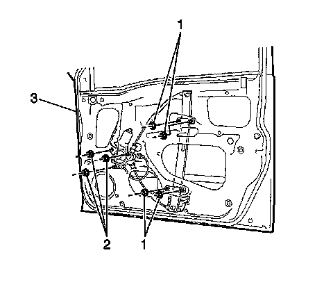 2. Install the front side door window regulator through the large opening in the inner portion of the front side door (3). Secure the regulator to the door with the 4 bolts (1) and the 3 nuts (2).