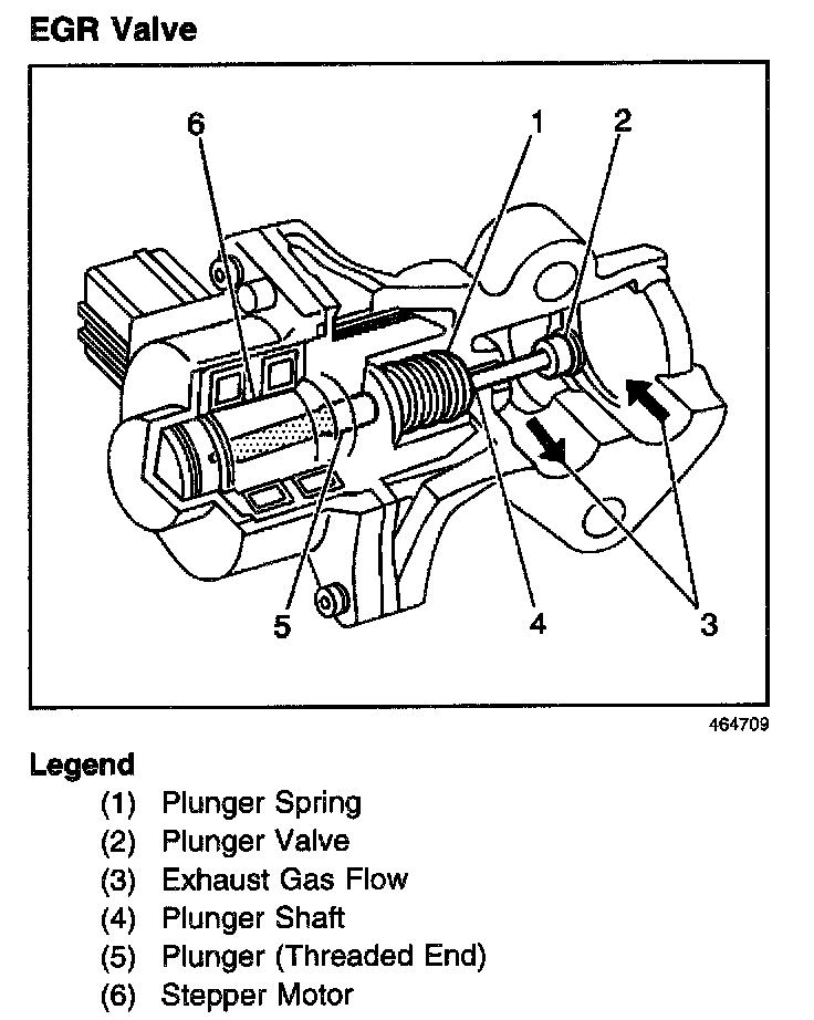 The EGR valve is a stepper motor design. A stepper motor (6) drives a worm gear, that is in mesh with a spring (1) loaded plunger (5). The valve (2) end of the plunger (4) controls the flow of exhaust gases (3). The plunger movement is controlled by the Powertrain Control Module (PCM). By turning the stepper motor in different directions, the PCM controls the opening of the exhaust gas passage to the intake manifold.
