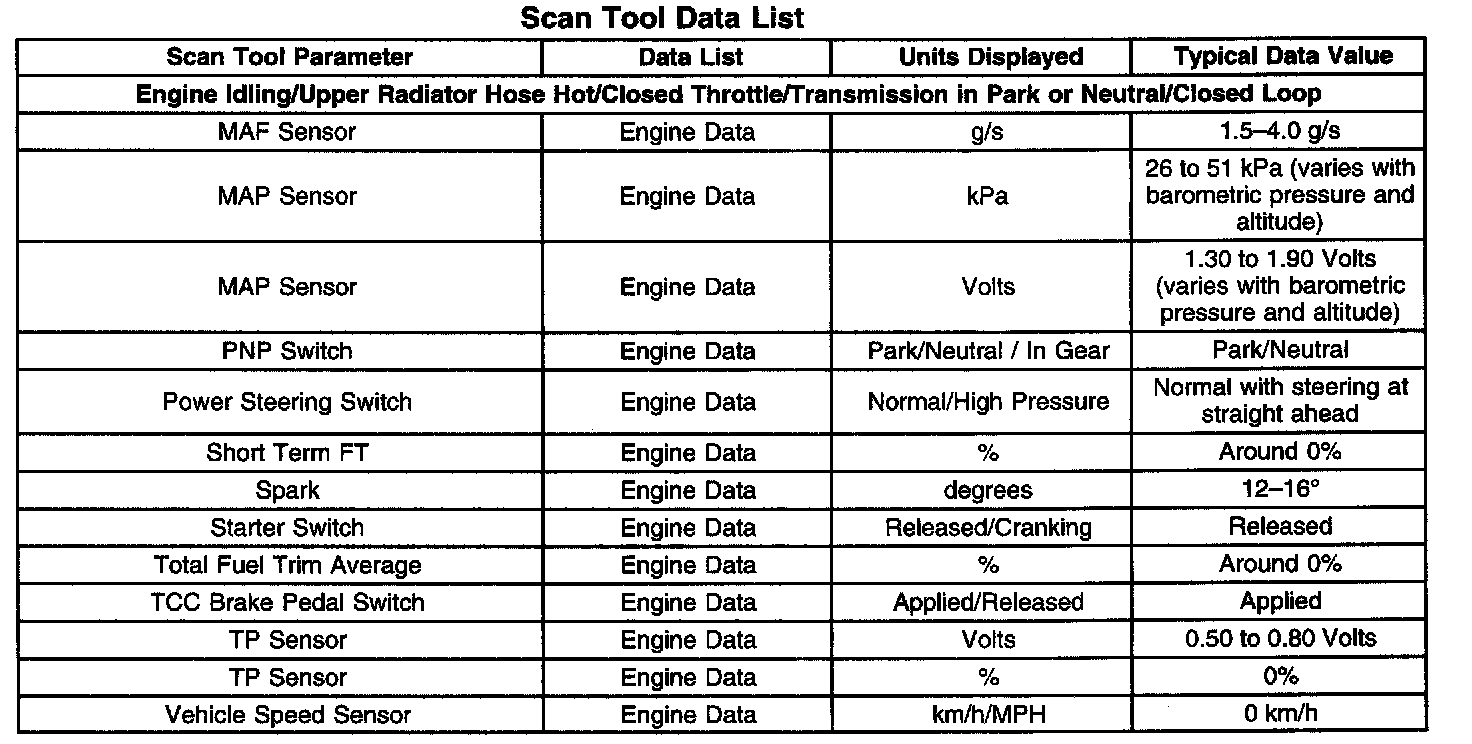 The scan tool values from a correctly operating engine may be used for comparison with the engine you are diagnosing. The values listed in the following table represent typical values that would be seen on a good running engine.