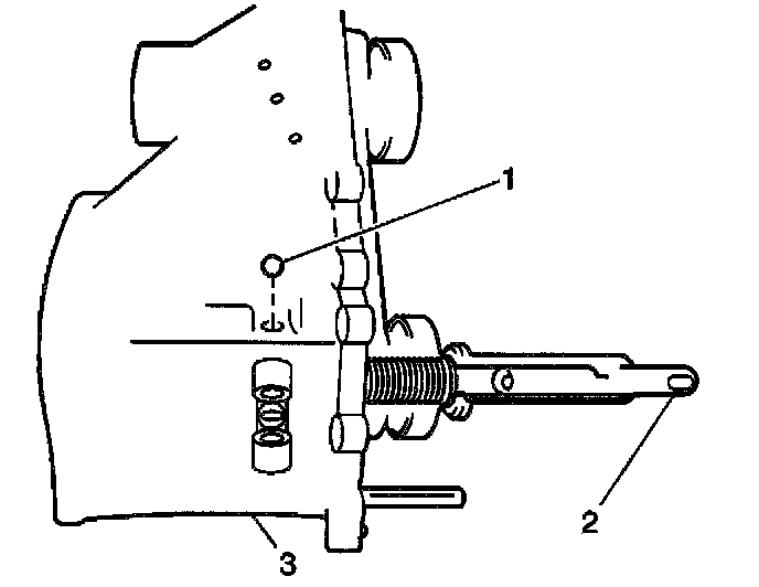 24. Install the interlock ball (1) into the center case passage. Push against the interlock notch of the front drive shift shaft (2).