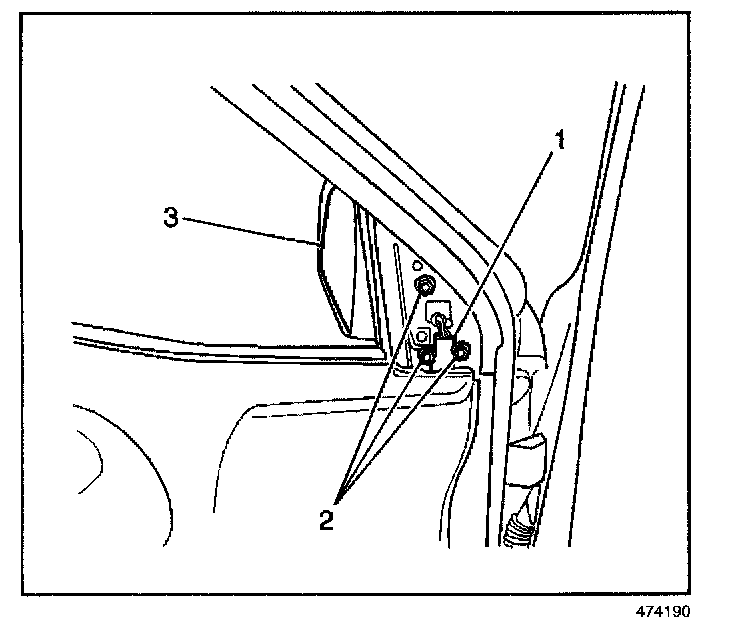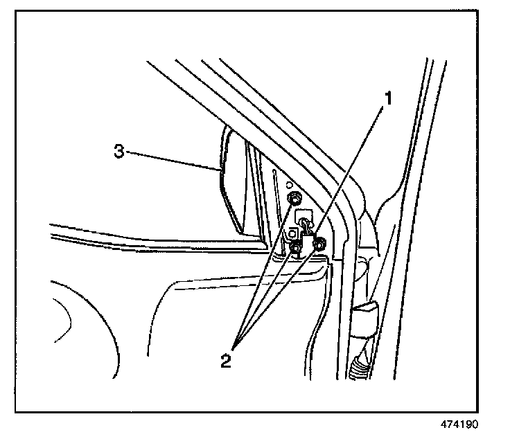 3. Remove the 3 bolts (2) and outside rearview mirror (3) from the door.