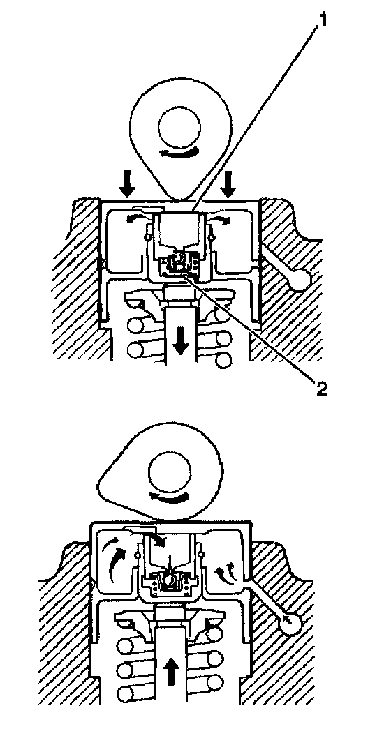 1. When the camshaft is not depressing the HVL adjuster, the adjuster is held against the camshaft and the valve stem by the plunger spring. In this state, the valve lash is kept at 0 (At 0 valve lash, the oil pressure becomes equal in the A (1) and B (2) chambers, and the check ball closes the passage between these two chambers.