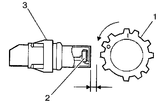 The CMP sensor (3) contains a signal generator hall switch (2). A signal rotor (2), with 11 notches, is located in the CMP sensor housing and is driven by the camshaft. The CMP sensor has a specified air gap between the sensor core end and the signal rotor. When the signal rotor in the housing turns, a magnetic flux from the magnet is applied to the hall element repeatedly. The hall element generates a voltage that is proportional to the magnetic flux. This voltage signal is wave-shaped and is modified into a digital pulse before being sent to the PCM. The PCM uses the pulse and/or revolution signal in determining the engine speed and the position of each cylinder.