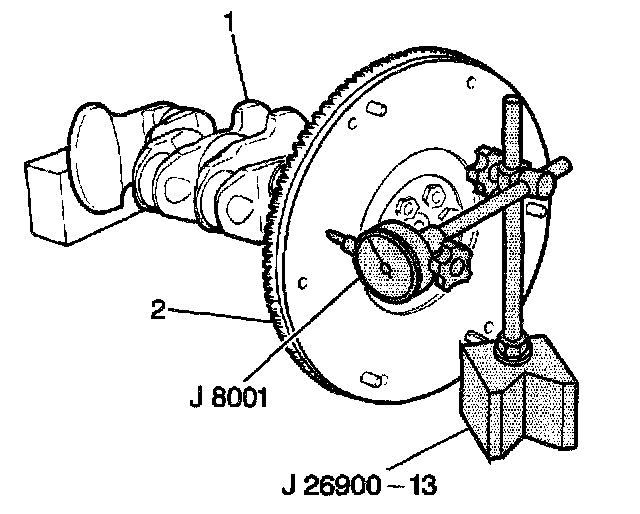 3. Measure the flywheel face runout using a J 8001 with a J26900-13. Replace the flywheel if the runout exceeds specifications.