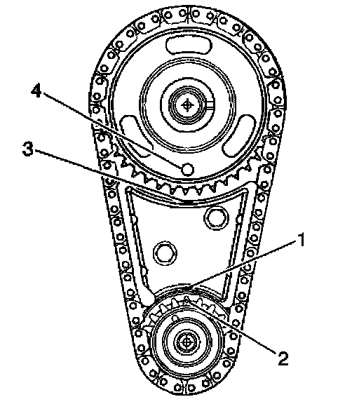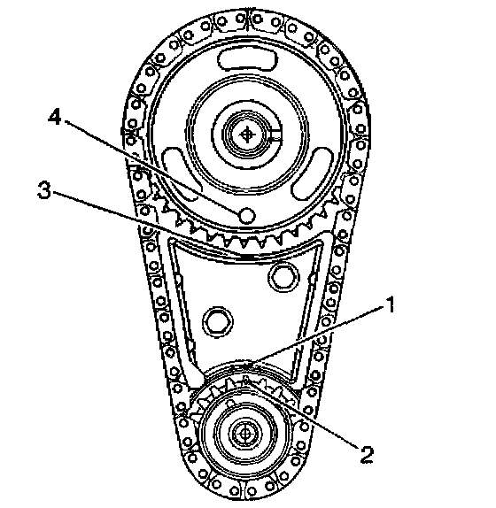 7. Align the timing mark on the camshaft gear (4) with the timing mark on top of the timing chain dampener (3).