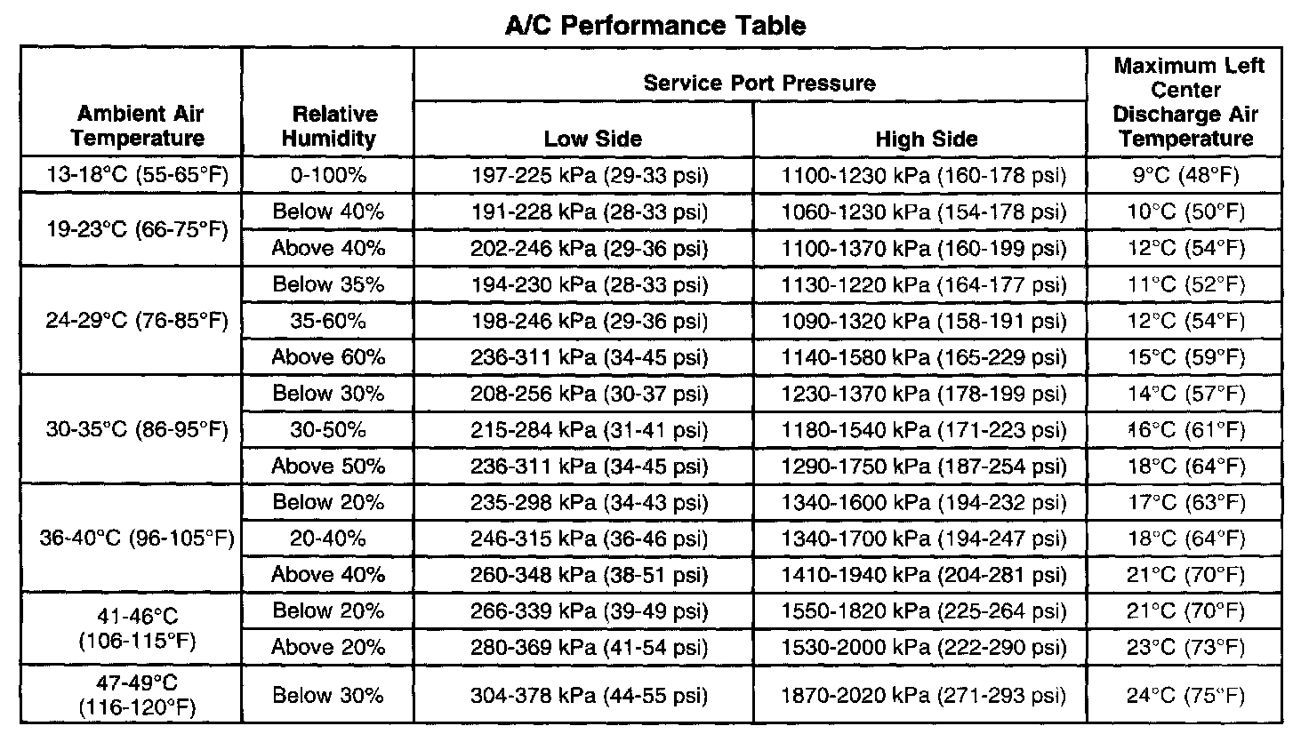 A/C Performance Table: