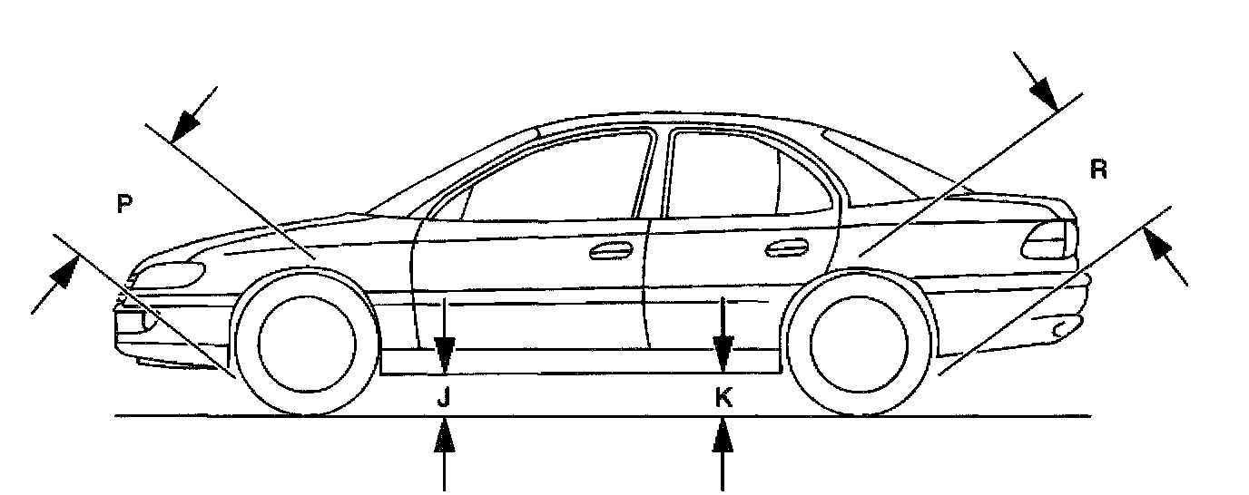 4. Replace the front springs in order to correct the front trim heights. Measuring K and R Dimensions Repeat the procedure described for measuring the J and P dimensions using the rear bumper and measuring K and R at the appropriate locations. The Automatic Level Control (ALC) system must be operative while taking these measurements.