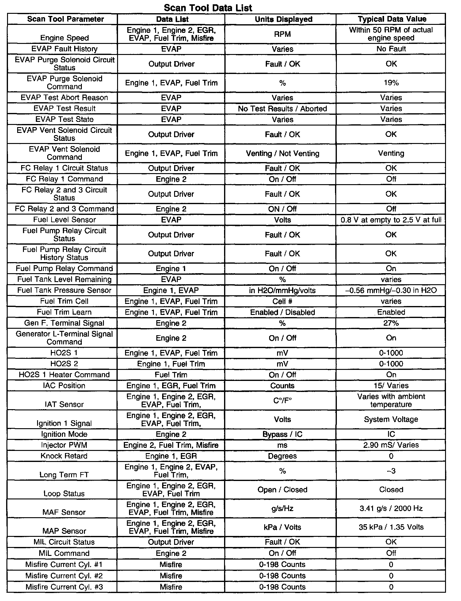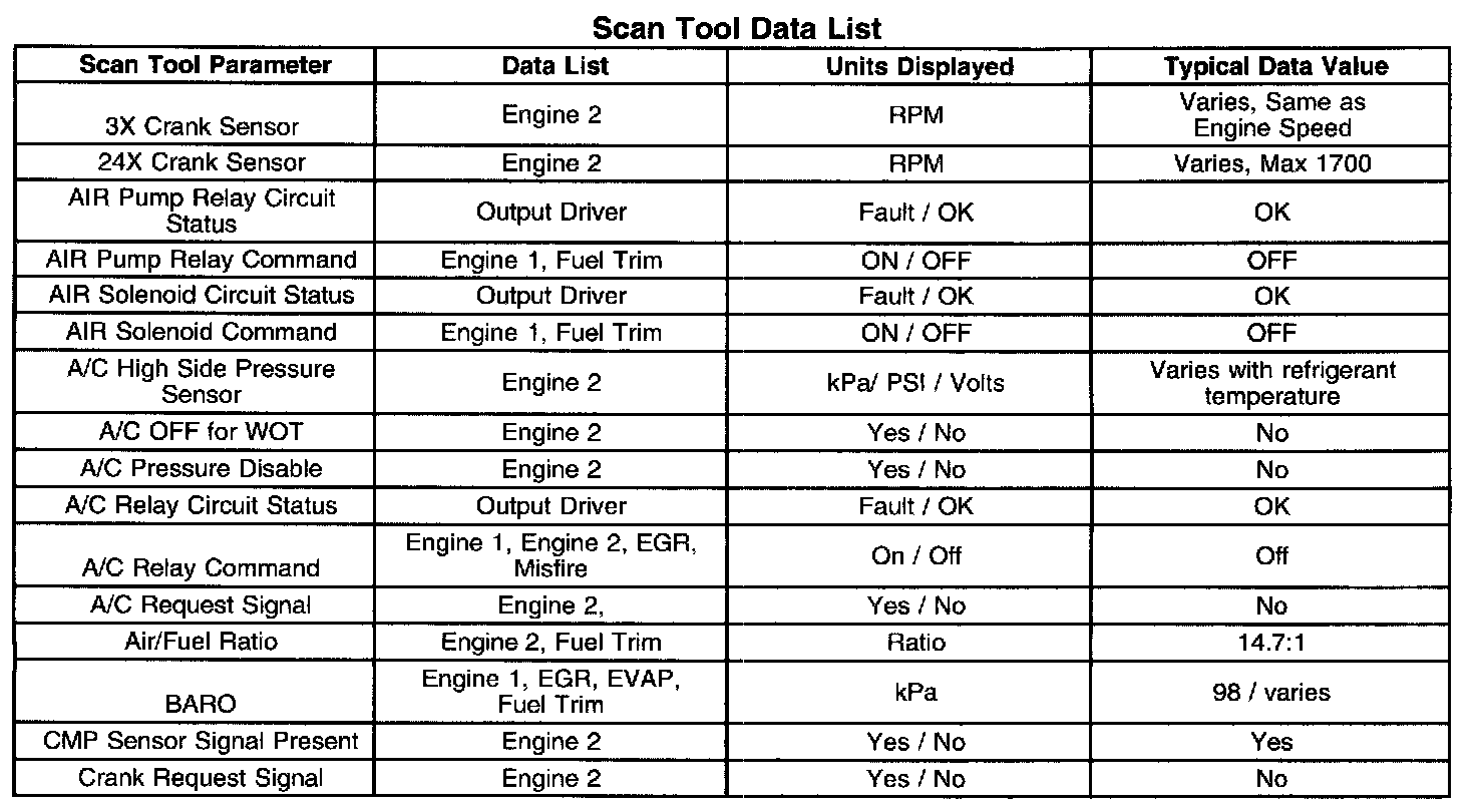 - Engine Data 1-Contains general information regarding fuel delivery, idle air control (IAC) position, Heated Oxygen Sensor (HO2S 1), HO2S 2, and other basic engine operating conditions.